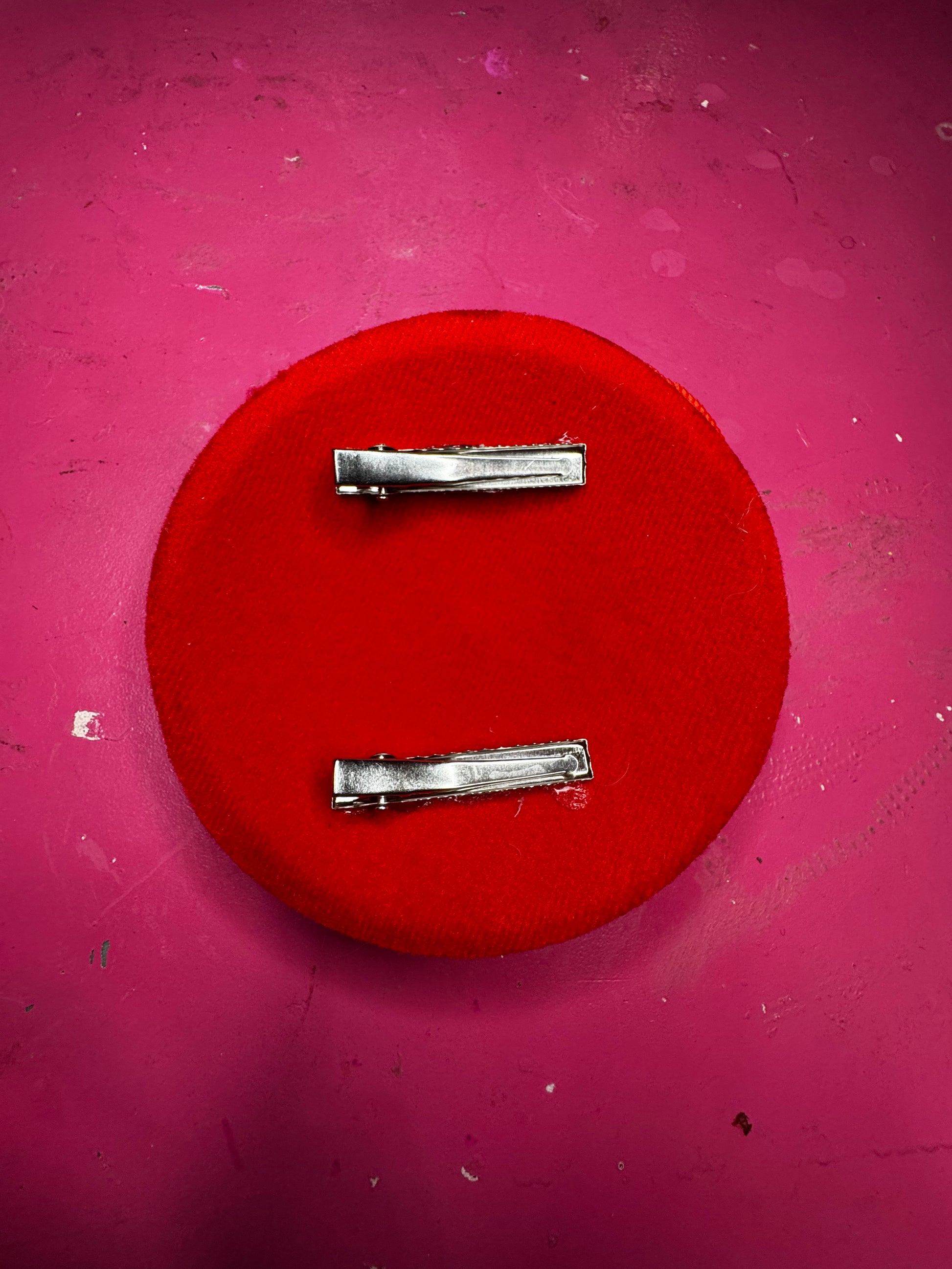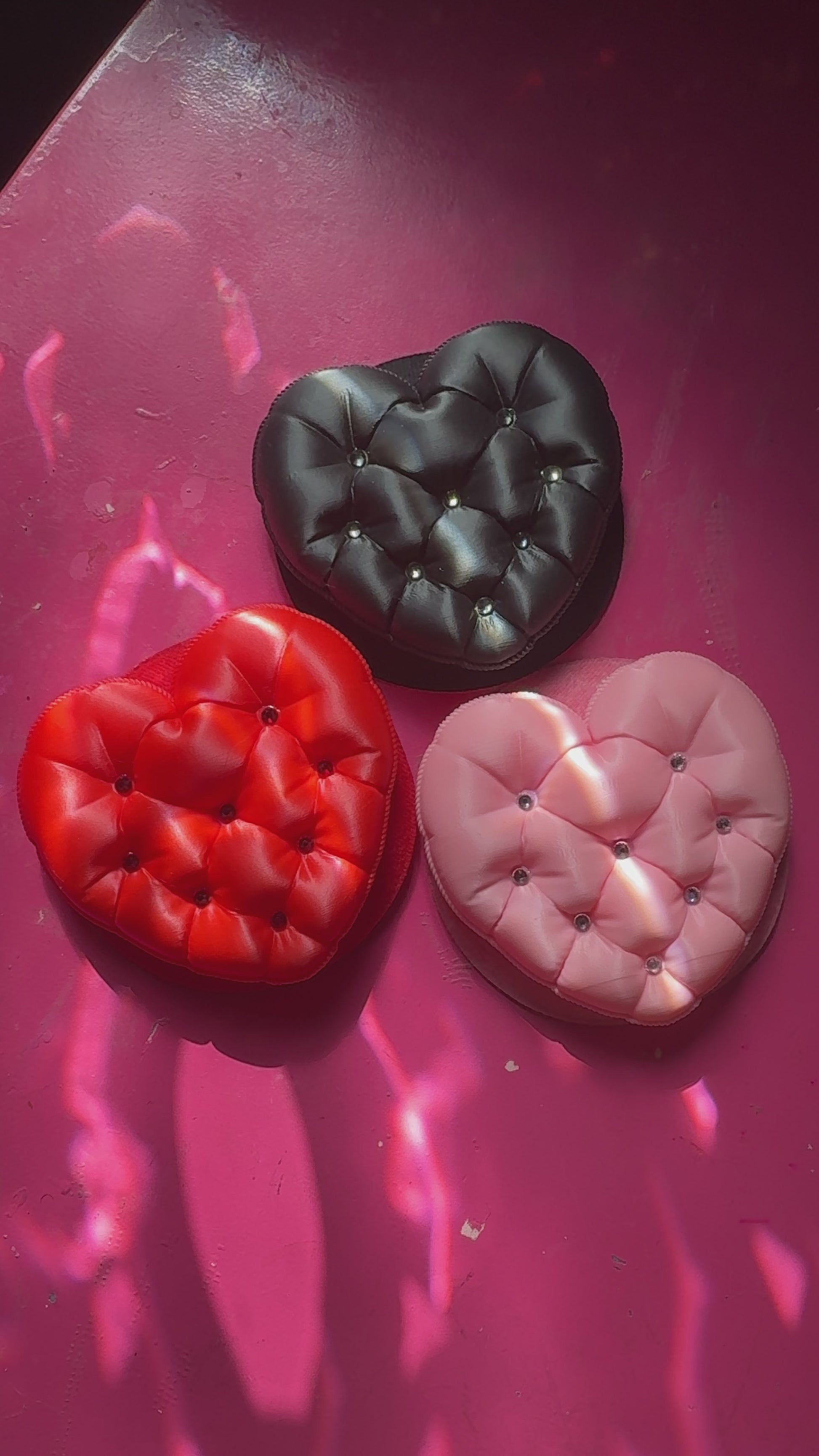 The Tufted Heart Fascinator is a statement hair accessory featuring a 3D printed heart reminiscent of a padded, quilted sofa. This fascinator features a few hand-placed rhinestones. Designed for secure, comfortable wear, this fascinator clips directly into the hair.